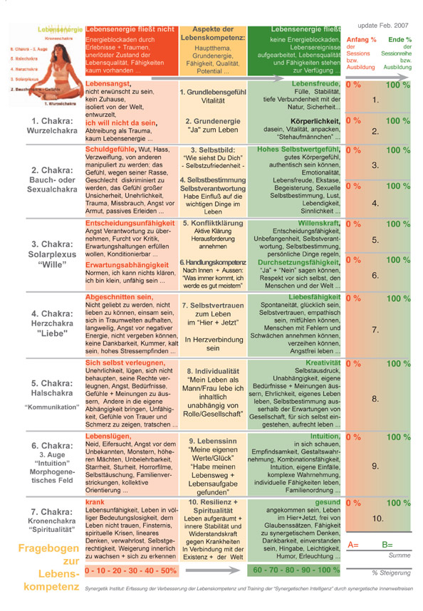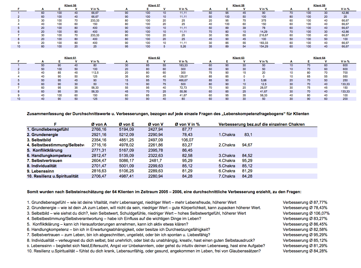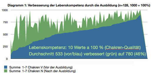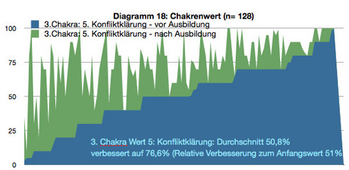 | Bestimmte Werte wurden erfasst. Hier die Fähigkeit zur Konfliktklärung | Die Grundenergie des 1. Chakra verbesserte sich auffäliig intensiv. | Auch im Magic Seminar gab es große Verbesserungen |
