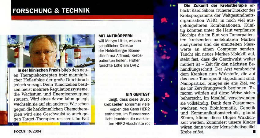 Jungen Dominik zeigt dies gut auf. Das herrschende Weltbild kann man am besten wahrnehmen, wenn man die veröffentlichte Meinung betrachtet. Im Fokus Nr. 17 vom April 2004 wird unverholen für die Chemotherapie Werbung gemacht. Offentsichtlich eine Reaktion auf den kürzlich tobenden Kampf des Dr. Rath mit der Pharmaindustrie wg Dominik. Die Presse hatte überwiegend auf der "Pharmaseite" gestanden und Dr. Rath konnte nur öffentliche Aufmerksamkeit bekommen, weil er selbst hohe Summen in seine Werbungkampagne steckte. Hier wurden die unterschiedlichen Grundhaltungen beider Strömungen in der Gesellschaft gut sichtbar: Krebs muß bekämpft werden oder soll man mit Vitaminen die eigene Abwehr stärken? Dr. Rath hat gewonnen. Einzelheiten unter: Chemo oder Pillen |
