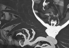 Wenn es extrem wird, dann fange ich an lebendig zu werden, so sieht es aus. Die Schlange fällt in sich zusammen. Jetzt schwimmt sie in dem Blut, wie Öl, haftet so an Ihr. Sie stirbt. ... Formen ... und alles verklebt. Ich bin fassungslos. Na, die schlängelt sich so weg von mir, wie auf so einen Spiegel zu, wie so ein Spiegelbild. In dem Spiegelbild bin ich. Diese Dämonen sagen: Wir sind auch da! Und sie sagen, Du wirst uns nie los werden! In diesem Spiegel sind jetzt ganz viele Fratzen, wieder meine alten Bekannten. Da lachen lauter Fratzen zu mir und Grimassen. Ich laß sie einfach, sowohl die Dämonen als auch die Fratzen und die Gnome und die ganzen Spinner da; ich laß sie einfach da so sein, wo sie sind und die Schlange dreht sich ganz verschämt weg, so... ist höchst beleidigt und die Dämonen die schlingeln so (pfeift) ...weißt Du? Holen sich die Energie, so... so klinken sich ein bei mir. Also ich sehe jetzt diese ganzen Dämonen, die vorher so in Aufruhr waren, da in diesem Spiegel und die sitzen da alle ganz ruhig. Jetzt frag ich mal die Schlange. Die Schlange ist sowas, wie Big Boß, die hat auch mein Spiegelbild in sich, also die andere Seite ist sie. Die ist aber auch wirklich so, weißt Du, wie in dem Aladin-Film, die Schlange. Sie wendet sich ab. Jetzt geht das wieder los. Aja, klar, tun die Augen wieder weh. Sie sagt, ich laß Dich aber nicht in Ruhe.