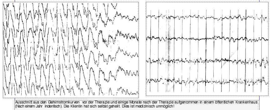 Die Klientin hatte schon vor der Synergetik Therapie einige Erfahrun-gen mit Selbsterfahrungs-therapien. Sie buchte das Konzept „Bezahlung nur bei Erfolg“ im Synergetischen Therapiezentrum Kamala. Der dargestellten Einzelsitzung in Synergetik Therapie gingen 4 Aufarbeitungssitzungen voraus. Nach diesem Therapieblock ging sie in ein öffentliches Krankenhaus und ihre Gehirnstromkurven - die sich bei Epileptikern in der Regel nie verändern (Sie werden für immer unter Medikamente gesetzt oder bekommen Teile ihres Gehirns herausgeschnitten! ) - waren normal. Dies ist medizinisch unmöglich. Daraufhin absolvierte sie die Ausbildung in Synergetik Therapie und arbeitet heute als Heilpraktikerin in der Innenwelt ihrer Klienten.