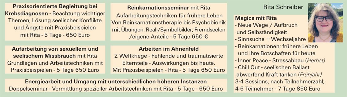 3) Therapiewoche mit Bernd, Rita oder Astrid 7 Sessions Innenweltsurfen® zu jedem Thema. Jede Session