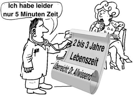 3. Session: GlaubeDie Klientin wählt diesesmal die dritte Tür auf der linken Seite mit der Auschrift „Glaube“. Sie findet sich alleine in einer Kirche wieder, wo sie, wie sie sagt, sehr gerne ist. Sie sieht ihre Eltern und ihre Großmutter, begrüßt sie und freut sich sehr, sie zu sehen. Die Klientin erzählt unter Tränen, daß sie von den dreien angelächelt wird und sie ihr sagen, sie fänden es auch schön, sie hier zu treffen. Der Mann der Klientin steht bei ihr, hat seinen Arm um ihre Schulter gelegt und sagt, er habe ja versprochen, ihr zu helfen. Die Eltern der Klientin haben einen sehr gütigen Gesichtsausdruck und sagen ihr, sie soll nicht so viel zweifeln. Kl: Ich möchte glauben, aber ich habe noch so viele Zweifel. Th: Erzähle mal deinen Eltern von deinen Zweifeln. Kl: Ich zweifle immer noch daran, daß ich es wirklich schaffen werde, obwohl ich ganz im Inneren spüre, daß ich es schaffe. Aber die Angst ist immer noch da, weil der Krebs schon so weit fortgeschritten ist mit den Metastasen. Das ist so ein Wechselbad der Gefühle - Schaffe ich es oder schaffe ich es nicht? Aber so ganz im Stillen und ganz im Tiefen weiß ich, daß ich es schaffe. Sie sagen, wir sind doch bei dir, um dir zu helfen. Glaube doch ganz fest, das hilft dir. Und du wirst es schaffen. Mein Mann lächelt mich an und sagt: Siehst du, da hast du wieder die Bestätigung. Nun glaube doch endlich. Der Therapeut macht den Vorschlag, die Eltern der Klientin sollen ihr auf ihrem Weg das nächstwichtige Bild, die nächstwichtige Situation, das nächstwichtige Ereignis zeigen. Die Klientin fragt ihren Vater unter Tränen, was sie noch auflösen soll und er antwortet: Deinen Zweifel. Der Vater zeigt dann der Klientin, wo ihr Zweifel entstanden ist. Er führt sie in die Praxis des Radiologen. Kl: Ich sehe die Aufnahmen des Knochenszintigramms, also von diesem Durchleuchtungsapparat, wo man die Röntgenbilder sieht. Und ich bin so geschockt über die Metastasen, die da sichtbar sind als dunkle Punkte. Th: Sprich direkt zu diesen dunklen Punkten. Kl: Dunkle Punkte, ich bin so geschockt euch zu sehen. Ich hatte gehofft, ich hab keine Metastasen im Knochensystem. (weint) Jetzt in zwei Jahren haben sich soviele Metastasen gebildet, obwohl ich doch die Medikamente genommen habe und immer regelmäßig zur Nachsorge gegangen bin. Das war immer alles in Ordnung und der Doktor hat noch im Sommer gesagt: Sie haben es überwunden, sie sind gesund. Und jetzt kommt dieser Hammer, wo das Knochensystem die ganzen Metastasen zeigt. Und da war ich wie gelähmt und ich habe gedacht, ich weiß nicht, ob ich das schaffen werde. Und dann hat der Arzt gesagt, ja dann bestrahlen wir erstmal ihre Hüfte und dann müssen wir noch eine Chemotherapie eventuell in Angriff nehmen. Und ich möchte weder bestrahlt werden, noch eine Chemotherapie. Th: Schau mal, wie dein Vater reagiert, der jetzt dabei ist. Kl: (weint) Er sagt, es gibt noch andere Wege. ... Vati zeig mir bitte diese anderen Wege. ... Er sagt, ich hab sie ja schon eingeschlagen. Ich soll nur ganz fest glauben und keinen Zweifel aukommen lassen. Die Klientin redet nochmal mit den Metastasen und sagt ihnen, daß sie sie in ihrer Hoffnung und Zuversicht so weit zurückgeworfen haben. Kl: Denn der Arzt hat gesagt, 2 höchstens 3 Jahre gibt er mir noch. ... Und er hat gar keine Zeit für mich gehabt. ![]() Th: Sag’s ihm wieder direkt. Kl: Herr Dr. B., Sie haben sich überhaupt keine Zeit genommen für mich. (weint) Sie haben doch gesehen, wie geschockt ich war und wie schwerwiegend dieser Befund war. Aber, nein für Sie war es wichtiger zu dieser Versammlung zu gehen. Sie haben mich als Patientin einfach allein gelassen. Ich war doch in dem Moment bestimmt wichtiger, als bei dieser Gesellschaft anwesend zu sein. Sie hätten ja auch noch 10 oder 15 Minuten für mich Zeit haben können. Nein, Sie haben mich einfach abgefertigt. Noch nicht mal 5 Minuten und dann war ich wieder draußen. Das gehört sich einfach nicht. ...Er schaut mich ganz erstaunt an, daß ich es gewagt habe, ihm das zu sagen. ... Es wäre so wichtig für mich gewesen, daß Sie sich etwas Zeit genommen hätten, um mit mir darüber zu reden. Denn für mich ist das doch lebensentscheidend. (weint) Aber ich bin ja nur ein Fall für Sie und die Menschlichkeit blieb ganz auf der Strecke. ... Mein Mann hat immer noch seinen Arm um meine Schulter, der läßt mich gar nicht los. Th: Guck doch mal, was der dazu sagt. Der soll auch mal mit dem Arzt reden. Kl: (weint) Ja, er sagt zu ihm: Also, als Kollege möchte ich Ihnen sagen, daß Sie überhaupt kein Herz haben. ... Der Dr. B. sagt jetzt, er wäre schon so abgehärtet, daß er sich gar nicht in die Situation der Patienten hineindenken und hineinfühlen kann. ... Er entschuldigt sich. (Klientin beruhigt sich). Der Therapeut macht den Vorschlag, die Klientin soll ihrem Arzt jetzt erzählen, daß sie sich jetzt mit ihren inneren Bildern beschäftigt und dadurch versucht, den Hintergrund des Krebses aufzulösen. Sie erzählt dem Arzt unter Tränen, daß sie mit ihren Metastasen spricht. Kl: (weint) Ich seh meine Metastasen nicht als Feinde, sondern als Botschafter, die mir etwas sagen wollen. Ich unterhalte mich mit ihnen, denn sie wollen mir alle sagen, daß ich leben soll. Und ich habe die Botschaft verstanden. Th: Und sag ihm jetzt auch sowas wie - Der Schock, den Sie mir gemacht haben, indem Sie mir nur noch 2 - 3 Jahre zu leben gegeben haben, der steht dem entgegen. Deshalb wäre es wichtig, daß er diese Botschaft zurücknimmt. So nach dem Motto - Ich weiß es nicht. Weil er weiß es wirklich nicht. Kl: (weint) Als Sie mir eben gesagt haben, daß ich nur noch 2-3 Jahre zu leben habe, das war wie ein Schock für mich. Damit nehmen Sie mir ja jede Hoffnung, daß ich weiterleben werde. Und ich will weiterleben. Th: Ja, und diese Botschaft wirkt im Unterbewußtsein. Diese Aussage muß er zurücknehmen. Kl: (weint) Diese Aussage von Ihnen zerstört in mir alles. Das is