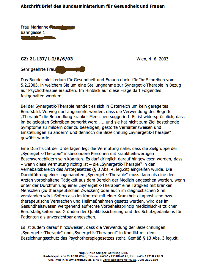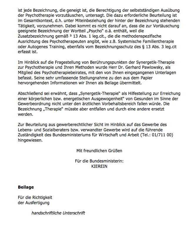Nur Ärzte dürfen heilen. Daher haben wir den Synergetik Therapeuten und Therapeutin für Österreich in Synergetik Coach umbenannt. Das eingeholte Gutachten vom Mitglied des Psychotherapiebeirates Dr. Gerhard Pawlowsky fiel positiv aus. Für die rechtliche Klärung zwischen 1995 und 2016 gab der Berufsverband in Kooperation mit dem Synergetik Institut von Bernd Joschko etwa 150.000 € aus. Jetzt dürfen wir Selbstheilung anbieten.